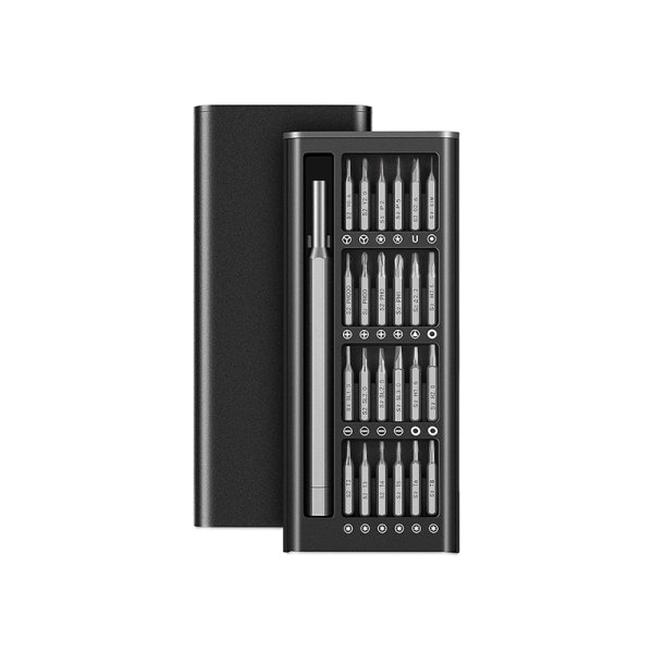 • Tournevis de précision comprenant un manche, 24 embouts ainsi qu'une boîte de transport.